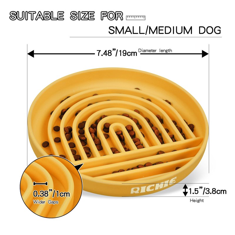 - 【REDUCE SLIP DESIGN & IDEAL SIZE】RICHIE dog bowl slow feeder is designed with suction base to prevent from sliding and spillage, so you don't have to worry about the slow dog feeder bowl being knocked over by your pet. Our dog food bowls slow feeder measure 7.48’’ DIA x 1.5’’ H, which is the ideal size to hold about 2 cups of food.