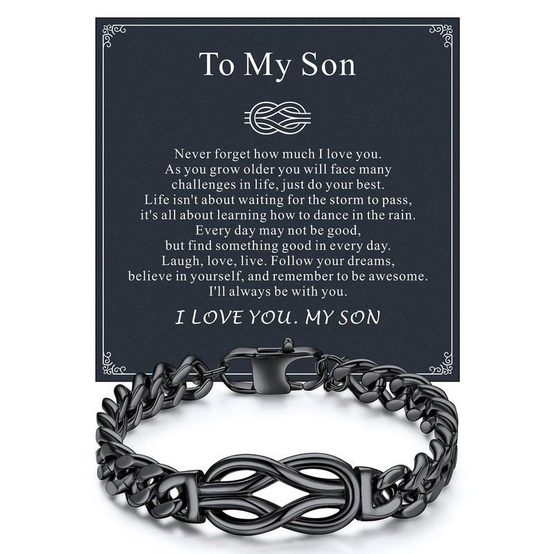 - Gift Card To My Son: Cool bracelet jewelry gift for Son, Crafted with a timeless stainless steel infinity knot design, this meaningful bracelet symbolizes an unbreakable bond of love and commitment. Each bracelet comes elegantly packaged in a gift box and includes a heartfelt wish card, deeply express your love for him