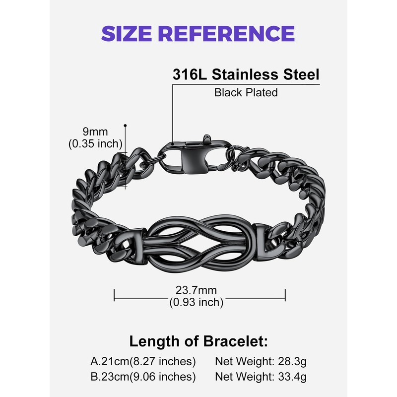 - NOTE: The bracelet is adjustable with a split ring clasp that can attach to any link on the chain, eliminating concerns about the bracelet being too loose.With a 9mm width and two length sizes for men bracelets: 21cm (8.2") – Classic Fit: Ideal for most men’s wrists (6.5"-7.8" circumference). Sleek and proportional for daily wear; 23cm (9") – Extended Comfort: Designed for larger wrists (7.8''-8.6"), ensuring a relaxed fit without tightness