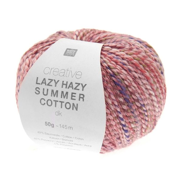 • Bringing vibrant, multi-tonal shades to a beautifully textured spiral-plied DK yarn in a perfectly balanced blend of cotton, acrylic and polyester, Ricos Creative Lazy Hazy Summer Cotton DK is the perfect companion for your casual me-made wardrobe this Summer. Ideal for hand knitted and crocheted garments and accessories with a joyful, carefree flair.