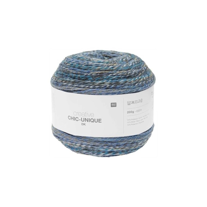 - Discover the Creative Chic Unique DK yarn from Rico Design, an exceptional yarn for your creations. Consists of 75% acrylic, 15% wool and 10% polyamide. This wool combines softness, resilience and warmth. Main Features: Composition: 75% Acrylic, 15% Wool, 10% Polyamide. Weight: 200 g, Yarn length: 695 m. Recommended needle size: 4. Colours and texture - twisted yarns made from modern blends. ...