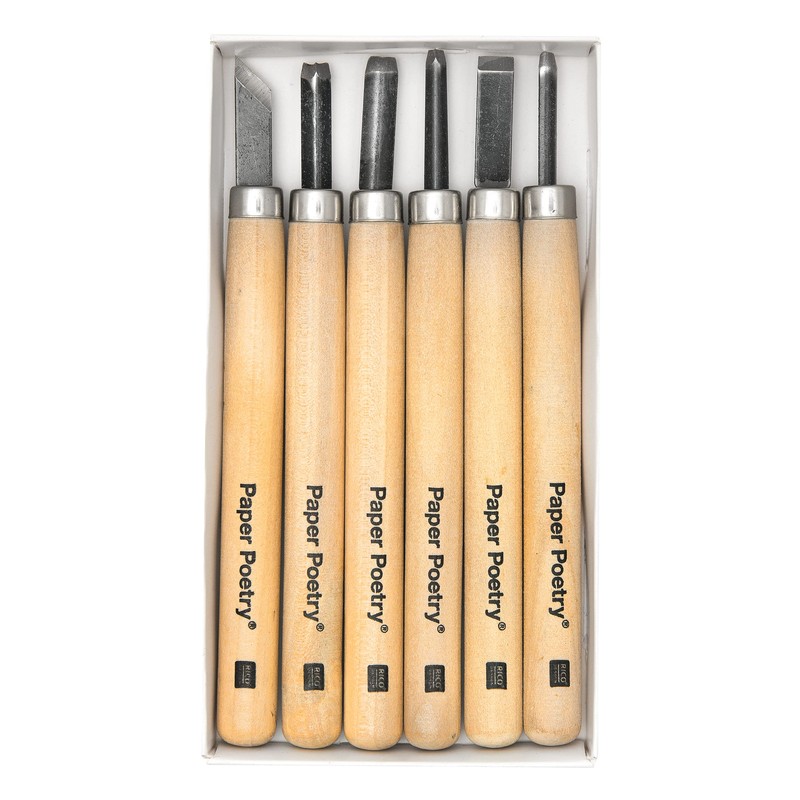 The set contains 6 different carving tools specially designed for making stamps. The different blades are ideal and perfectly sharp for carving foam rubber or stamp rubber into the personal motif shape.