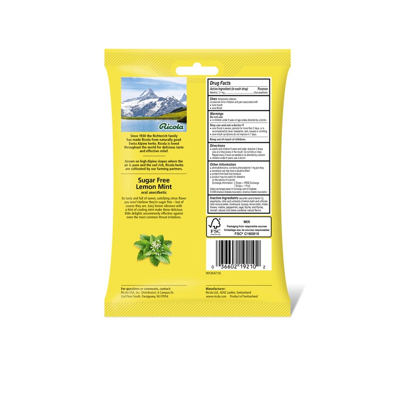 - RICOLA SUGAR-FREE LEMON MINT THROAT DROPS: Ricola Lemon Mint Throat Drops combine refreshing lemon and mint with soothing menthol, flavored by Ricola's delicious blend of Swiss alpine herbs. A sugar-free lozenge that is soothing, effective, & pleasant. Active Ingredient (in each drop): Menthol, 1.5 mg (Also available with sugar in our variety pack.)
