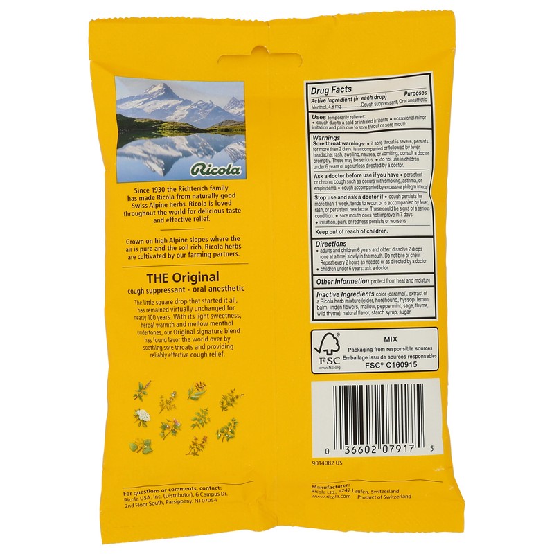 The original. Effective relief. Cough suppressant. Throat drops. Fights coughs naturally. Soothes sore throats. Original Ricola Natural Herb cough drops are made today just as they were in the 1930's using the highest quality natural herbs cultivated in Swiss alpine areas to ensure optimum taste and effectiveness. Herbs have been used around the world for centuries. For over 75 years, Ricola has been making pleasant tasting natural herbal products for natural relief of the discomfort due to sore throat and minor irritation due to coughs, hoarseness, dry throat, and loss of voice. Ricola is nature's way of calming coughs and soothing sore throats. Product of Switzerland.