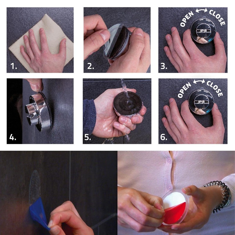 - 使い方は簡単です。 1. 設置面を市販のガラスクリーナーなどで丁寧に拭く。 2. キャップ表面のシールを剥がし、設置面に軽く押し当て時計回り(closeの方向)に完全にロックされるまで回す。 3. 設置してから1時間待ち、しっかりと吸着し設置できているか確認してから物を載せる。 4.取り外す場合は、キャップを反時計回り(openの方向)に回し、吸盤の端のひだをつかんで剥がす。 5.ゴミや埃がサクションキャップに付着した場合は、水で綺麗に洗い流し、完全に乾いてから再度設置する。 設置面の状態に不安がある場合には、付属の粘着パッドを使用することをお勧めします。粘着パッドは表面の凹凸を相殺するので、マットな面や傷のある面(穴の空いた面や木製ボードなど)でも吸盤が機能します。 それでもまだ十分でないと思われる場合は、別売りのメガログパットをご購入ください。メガログパッドはさらに凹凸を無くすので、漆喰やペンキを塗った壁でも吸盤が機能します。 粘着パッドまたはメガログパッドを使用する場合は、設置面を綺麗に拭いた後、まずこれらのパッドを貼り、その上にサクションキャップを設置します。