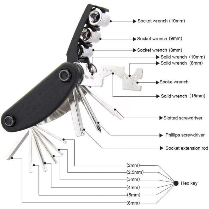 This quality Multi Function 16 in 1 Repair Tool is a must-have for any outdoorsman. It comes in a sleek Black Silver design and is made of durable Steel. Whether you need a Socket Wrench, Extension Rod, Flat Wrench, or 8/10/15 mm Spoke Wrench 14GE, this tool kit has got you covered. In addition, it also includes 6 Hex sizes (2, 2.5, 3, 4, 5, 6 mm) and Straight Flat Head & Philips Screwdrivers for quick and easy repairs on the go. Perfect for any application related to maintenance and repair. this item is a great addition to any cars glove box also.