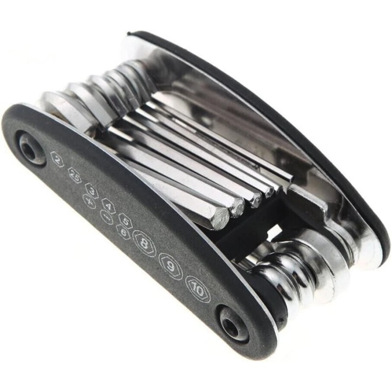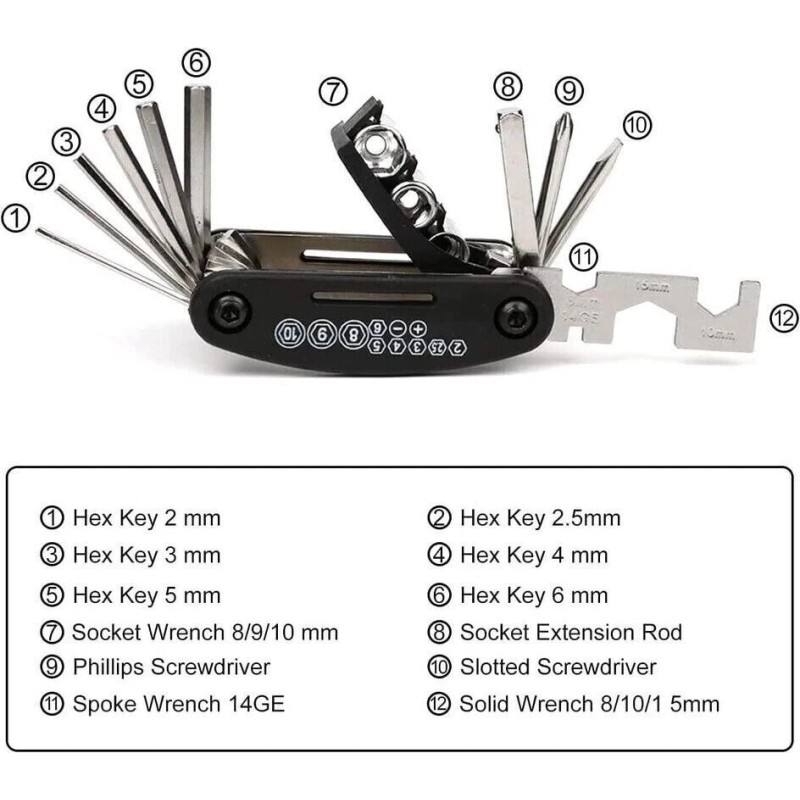 This quality Multi Function 16 in 1 Repair Tool is a must-have for any outdoorsman. It comes in a sleek Black Silver design and is made of durable Steel. Whether you need a Socket Wrench, Extension Rod, Flat Wrench, or 8/10/15 mm Spoke Wrench 14GE, this tool kit has got you covered. In addition, it also includes 6 Hex sizes (2, 2.5, 3, 4, 5, 6 mm) and Straight Flat Head & Philips Screwdrivers for quick and easy repairs on the go. Perfect for any application related to maintenance and repair. this item is a great addition to any cars glove box also.