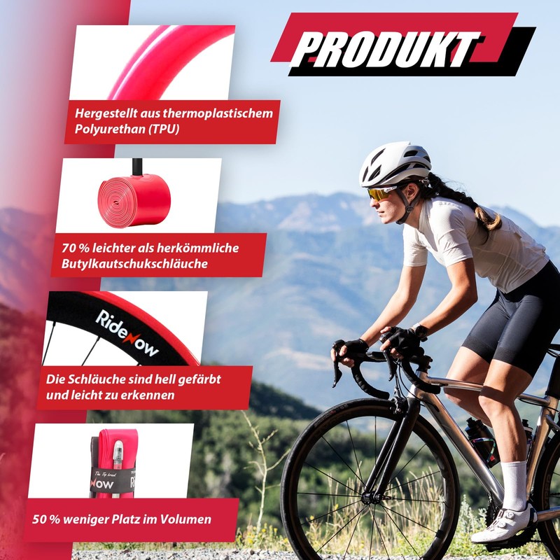 - ULTRA LIGHTWEIGHT & SPACE SAVING Made of TPU material, TPU tube weighs only 36g (up to 70% lighter than normal butyl tubes) and takes up 50% less space in the bag. Lightweight and easy to carry, bright colours for easy recognition. RideNow bicycle tubes are the ideal portable replacement tube