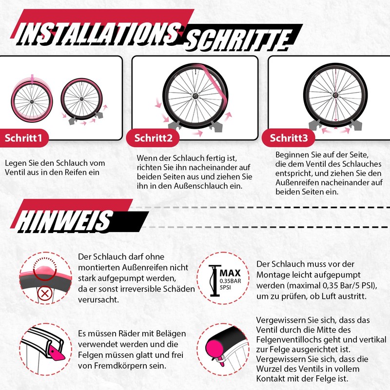 - Wichtiger Aufpumpen-Hinweis: Um Beschädigungen zu vermeiden, den Schlauch nicht übermäßig aufpumpen, wenn er nicht im Reifen sitzt. Bei der Montage zunächst mit nur ca. 0,5 PSI aufpumpen, damit sich der Schlauch an die Reifeninnenwand anlegt