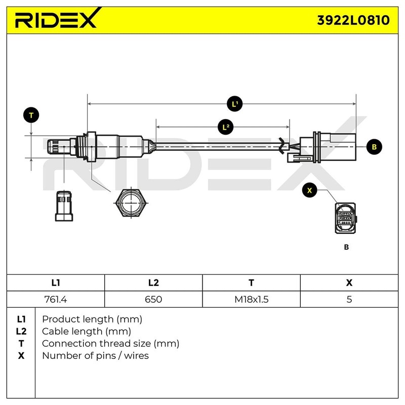 RIDEX 3922L0810 Lambda Sensor in Front of Catalytic Converter Oxygen O2 Sensor, Heated 650 mm