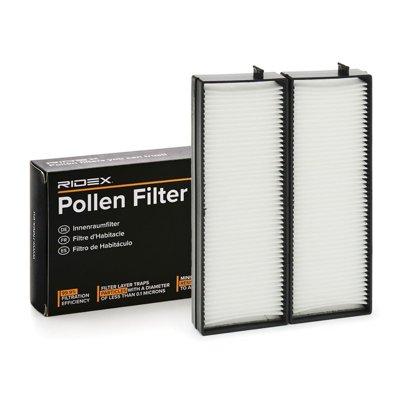 - Thanks to the multi-layer structure and electrostatic charge of the microfibre, the RIDEX cabin air filter retains up to 99% of pollen, mould and other particles smaller than 0.1 microns.