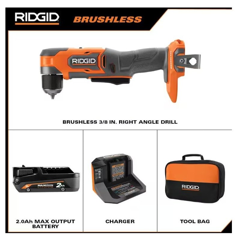 - 100% Compatible: Works with all RIDGID 18V Batteries Includes: R87701 18V SubCompact Brushless Cordless 3/8 in. Right Angle Drill, Drilling/Driving Bit, Bit Holder with Screw, Belt Hook with Screw, and Operator's Manual