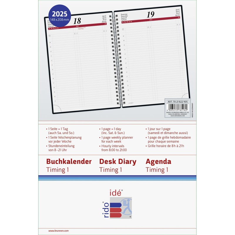 rido/idé Book Calendar Model Timing 1 (2025), 1 Page = 1 Day, A5, 464 Pages, Foam Film Cover, Black