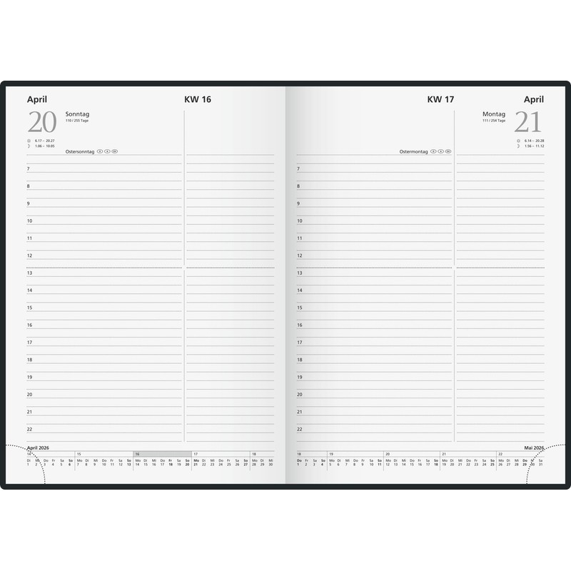 • 1 Seite = 1 Tag, 400 Seiten, Druckfarbe Kalendarium: schwarz, 70 g/m², Klebebindung