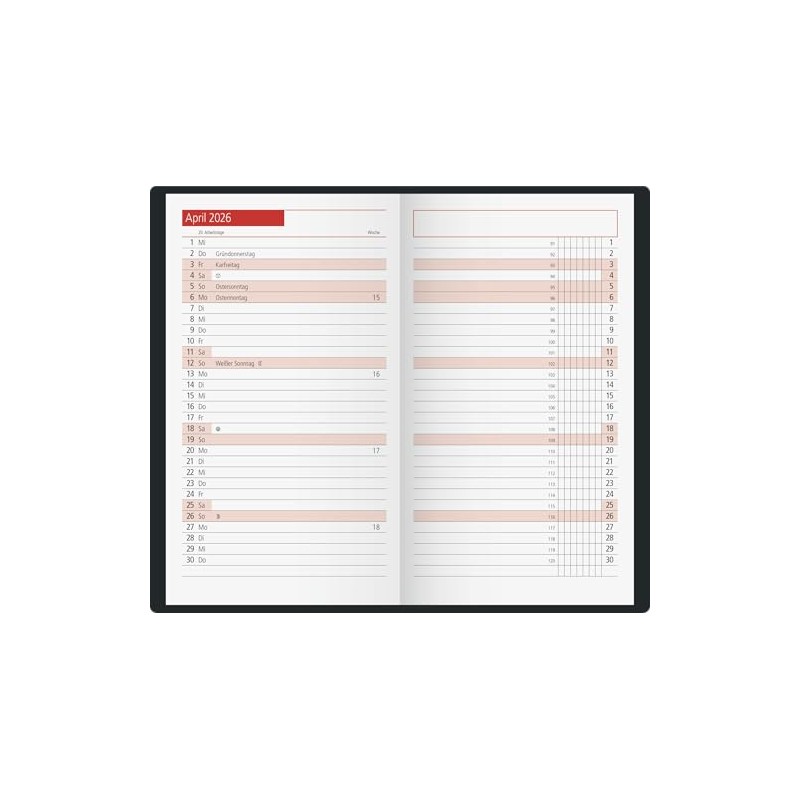 - Plastic cover, colour: black, year overview current year and following year, 3 pages monthly plan October to December previous year, 4 pages April to December following year, holiday dates Germany, 2 pages worth knowing, interchangeable address register book, 16 pages