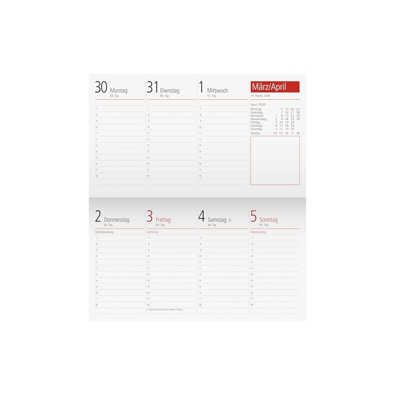 - 2 Seiten = 1 Woche, 128 Seiten, Druckfarbe Kalendarium: schwarz/burgund, 80 g/m², Klebebindung
