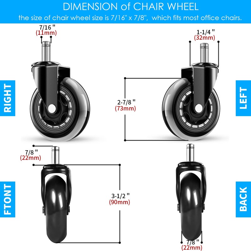 - [PERFECT DESIGN STYLE]: Office chair wheels is one-wheel mode, not double-row wheel mode, This makes everyone look more beautiful and practical. Our heavy-duty chair wheels are made from strong steel fabric & precision ball bearings & transparent polyurethane material, this make the office chair more stable and firm, let everyone rest assured (our stem size is 7/16" x 7/8")