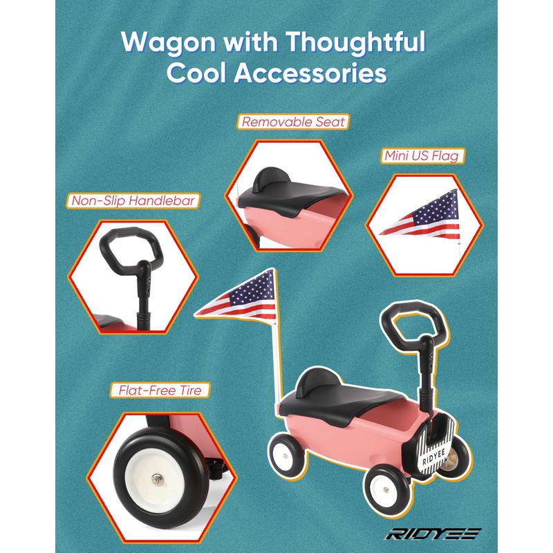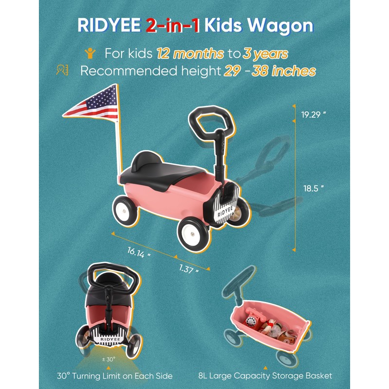 RIDYEE 2-in-1 Toy Wagon for Toddlers 1-3, Kids Pull-Along Wagon with Removable Seat and Adjustable Handlebar, Baby Push Walker with 8L Large Basket, Steering Limit, DIY Sticker, Pink