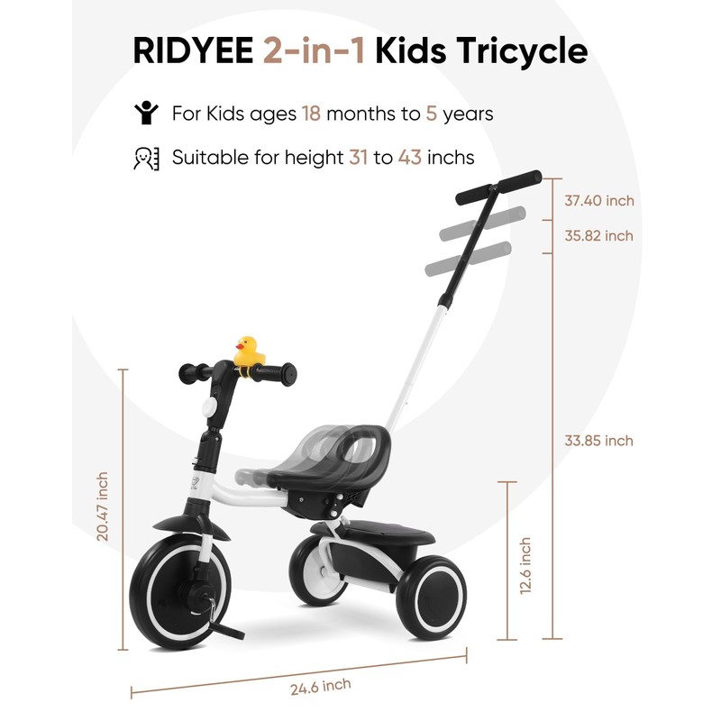 RIDYEE Tricycle for Toddlers 18 Months to 5 Years with Removable Push Handle, Tricycles for 3-5 Year Olds Ideal for On-The-Go Families, Toddler Tricycle with Adjustable Carry-Friendly Seat, White