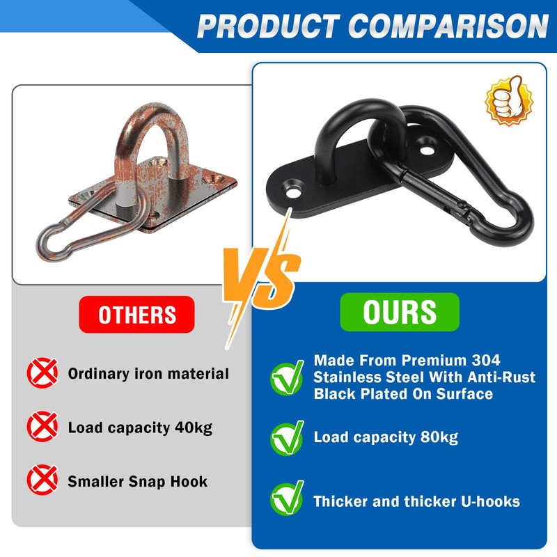 - Packaging: the package comes with 4 stainless steel eyelet plates, and 4 black stainless steel carabiners with 16 stainless steel screws and 16 expansion tubes.
