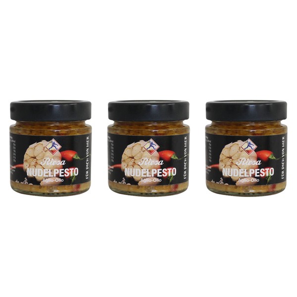 - A glass of Riesa pasta pesto Aglio Olio contains 190 g. You will receive a pack of 3.