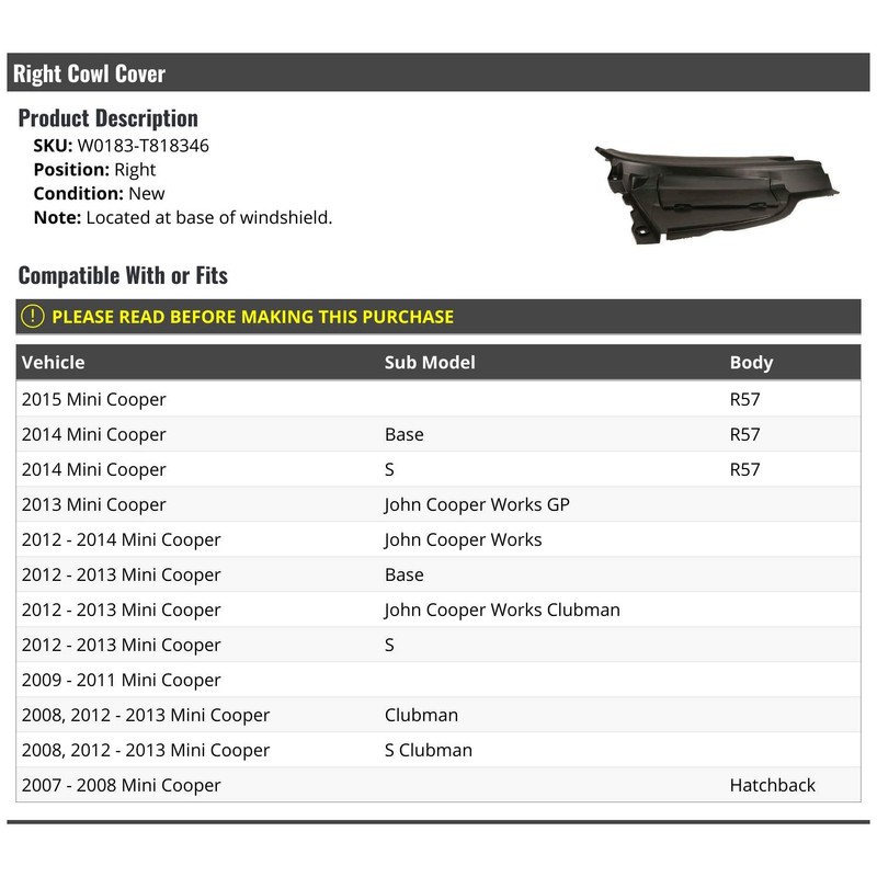 Right Passenger Side Cowl Cover - Located at Base of Windshield - Compatible with 2007-2015 Mini Cooper