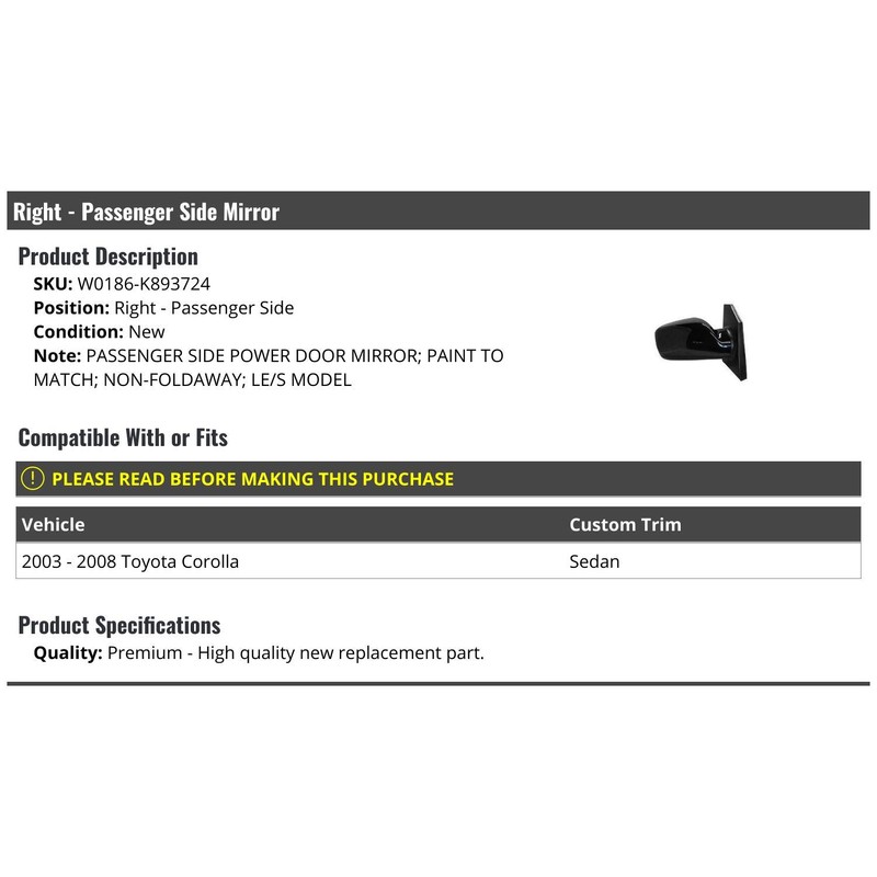 Right Passenger Side Power Mirror - Compatible with 2003-2008 Toyota Corolla LE/S (Non-Foldway)