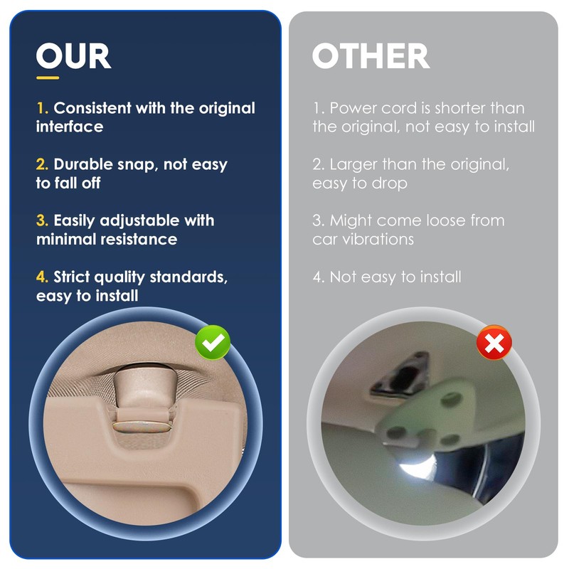 - Function: The car visor not only shields the passenger from the harsh sunlight, but also has a built-in illuminated mirror so that passenger can make up at any time.