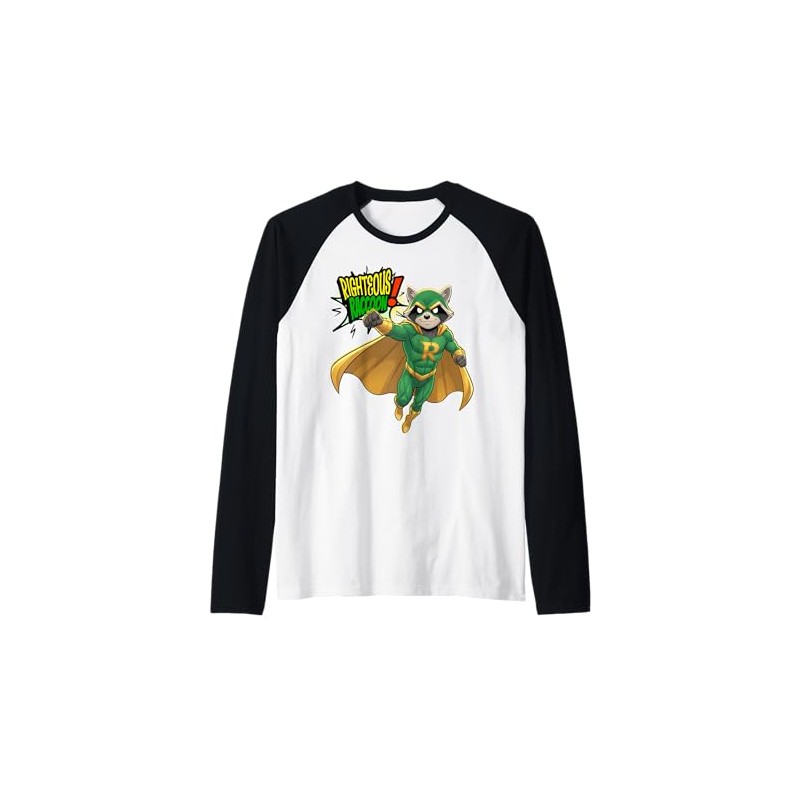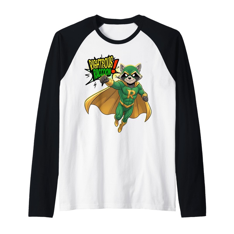 'Righteous Raccoon Superhero s Retro Comic Strip Raglan Baseball Tee