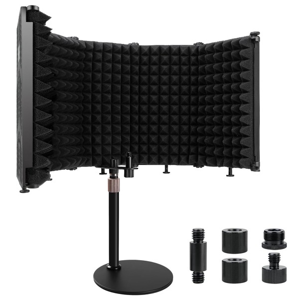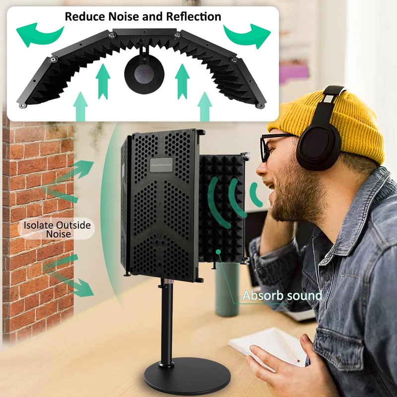 This mic shield that consists of 5 panels together and it's free to adjust the angle, increased angle of noise reflection for clearer recordings. The compact and foldable design makes it easier for you to carry it around you.
