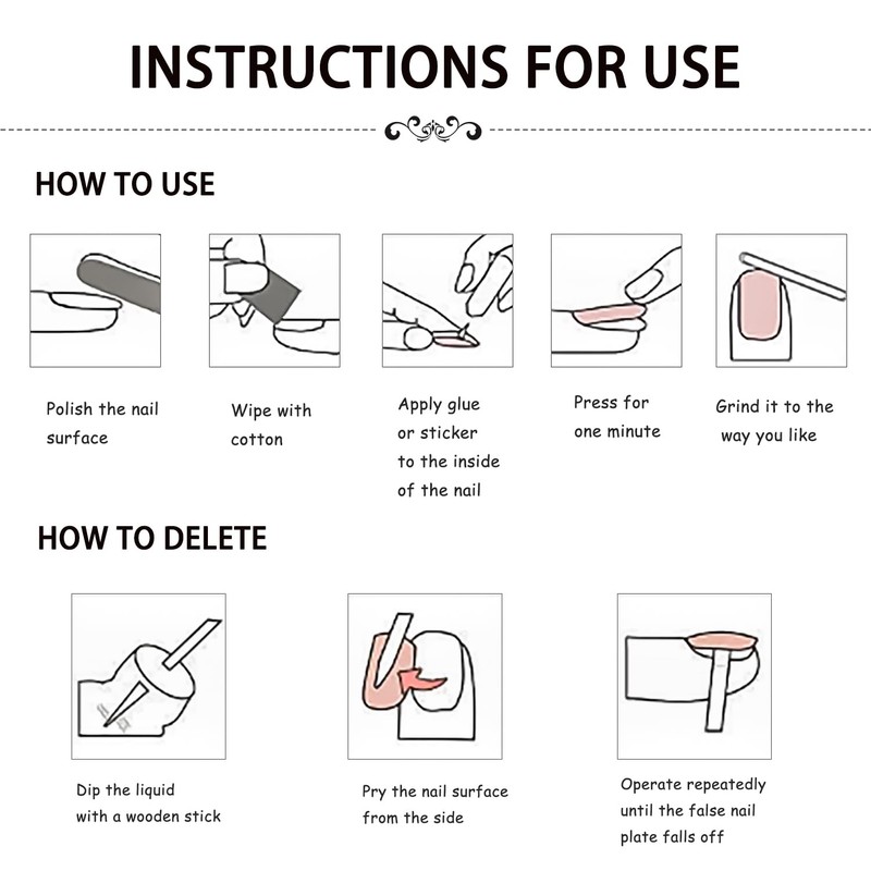 1. Please do not put acrylic nails in water for a long time, which will make the nails easy to fall off 2. Do not touch water for a short time after applying the fake nails, which will make the nails easy to fall off 3. Please avoid prolonged exposure to hot water and soap to extend the use time