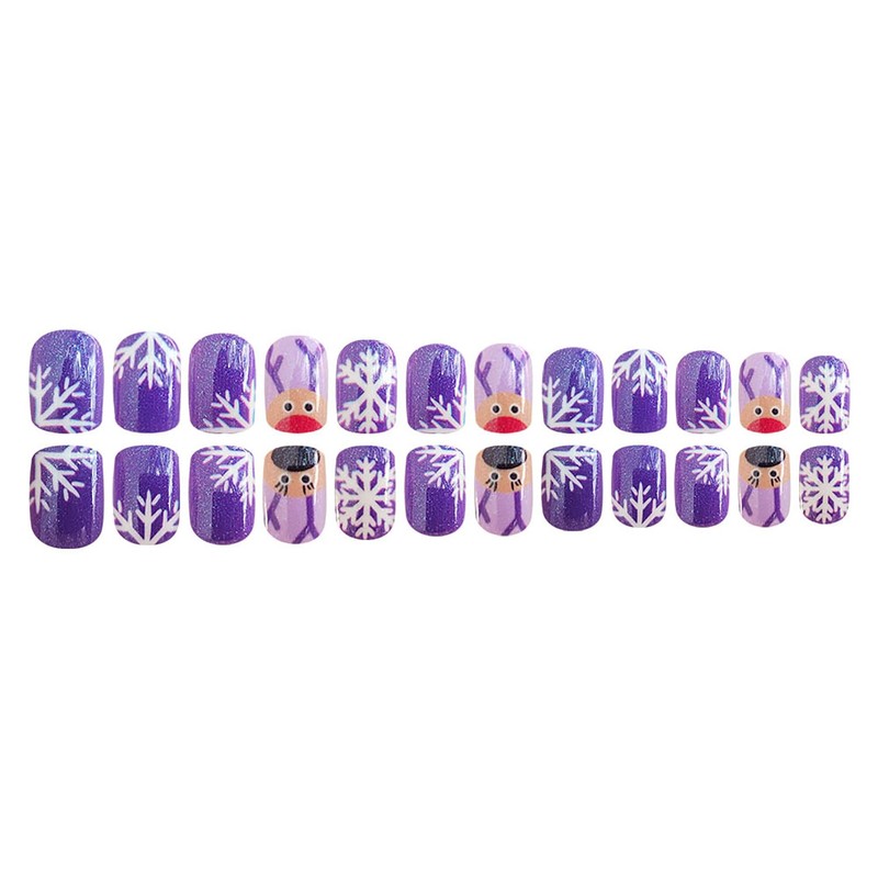 RIICFDD Christmas Press on Nails Short Coffin Fake Nails Purple Glitter Nails Press ons Snowflake Glue on Nails Cute Elk Face Stick on Nails Full Cover Glossy False Nails for Women Nail Art 24 Pcs
