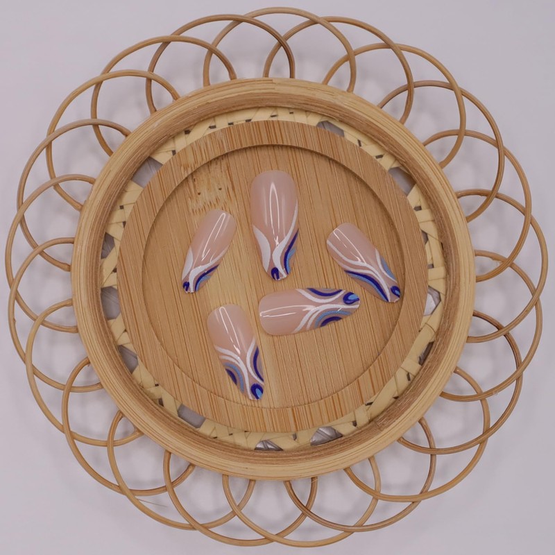 RIICFDD Medium Length Press on Nails Almond Shape Fake Nails Nude Acrylic Nails Artificial Glossy Nails Press ons with Blue White Curve Design Full Cover Glue on Nails for Women Nail Decor 24 Pcs