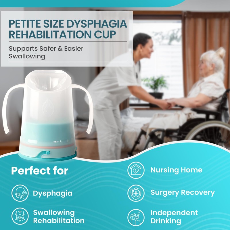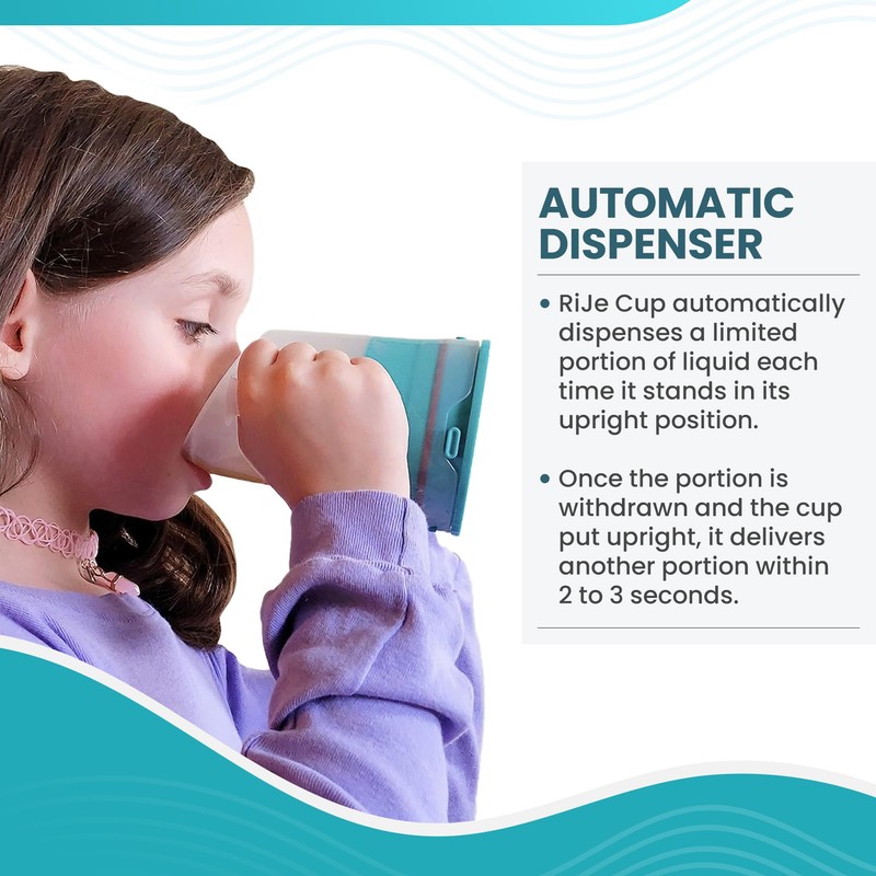- DYSPHAGIA REHABILITATION CUP: Helps with safer drinking by dispensing controlled small sips for those with swallowing disorders and other disabilities. RiJe Petite Cup automatically dispenses a limited portion of liquid each time it stands in its upright position. Once the portion is withdrawn and the cup put upright – it delivers another portion within 2 - 3 seconds. The cups design allows presetting the sip size before filling with liquid.