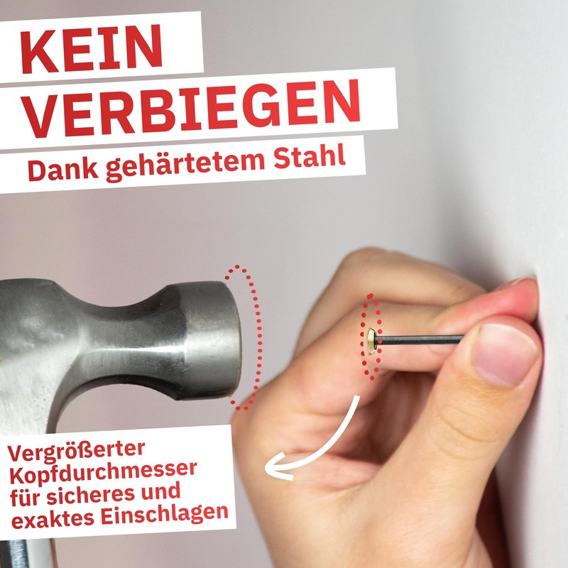- Robust steel: the nails are made of hardened steel, which makes them very stable and do not bend when used. The high-quality brass head allows a safe and precise impact into the wall thanks to an optimal impact surface. The precise steel tip prevents splitting of materials such as wood