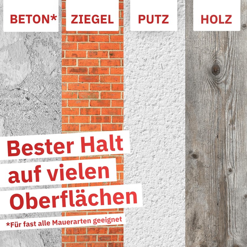 - Various surfaces: the application on a wide range of surfaces is ensured by the high stability of our steel pins. This means that the use of nails in use on most types of concrete walls, brick, plaster and wood is no problem