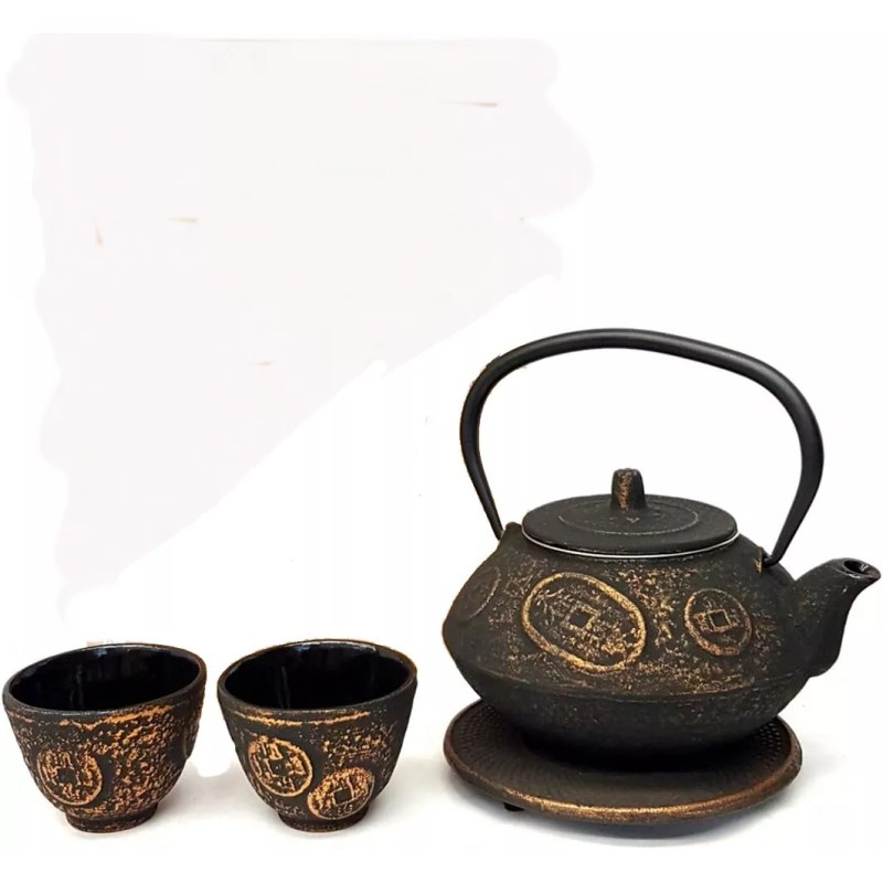 RIKYU Cast Iron Tetsubin 20oz Teapot Antique Ancient Gold Coin Pattern with 2 teacups