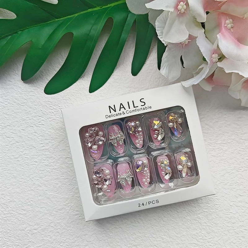 Rilafuvu 24Pcs Pink Press on Nails Almond Fake Nails Medium Acrylic Nails Full Cover Artificial Nails 3D Rhinestones False Nails & Accessories Bow Fake Nails With Nail Glue Luxury Fake Nails