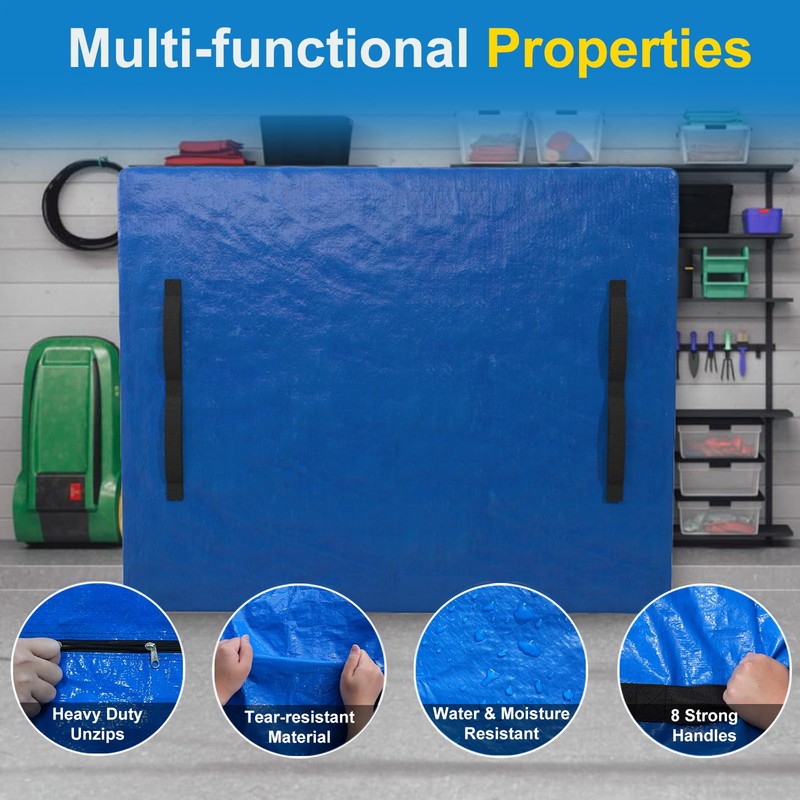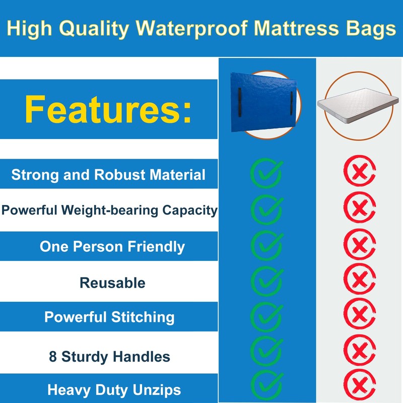 - 8 HANDLES & 2 ZIPPERS DESIGN: The mattress bag is sewn with 8 strong carrying handles, allowing you to carry your mattress with ease. The smooth double zipper design ensures effortless sealing of the mattress and easy access when needed