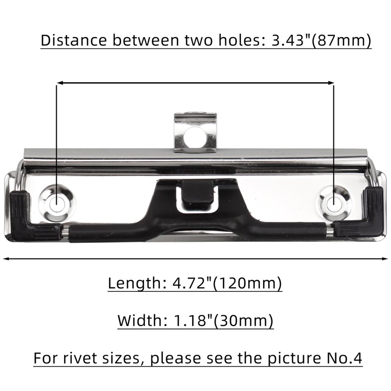 Size:Length: 4.72"(120mm), Width: 1.18"(30mm), Distance between two holes: 3.43"(87mm), For rivet sizes, please see the picture description.