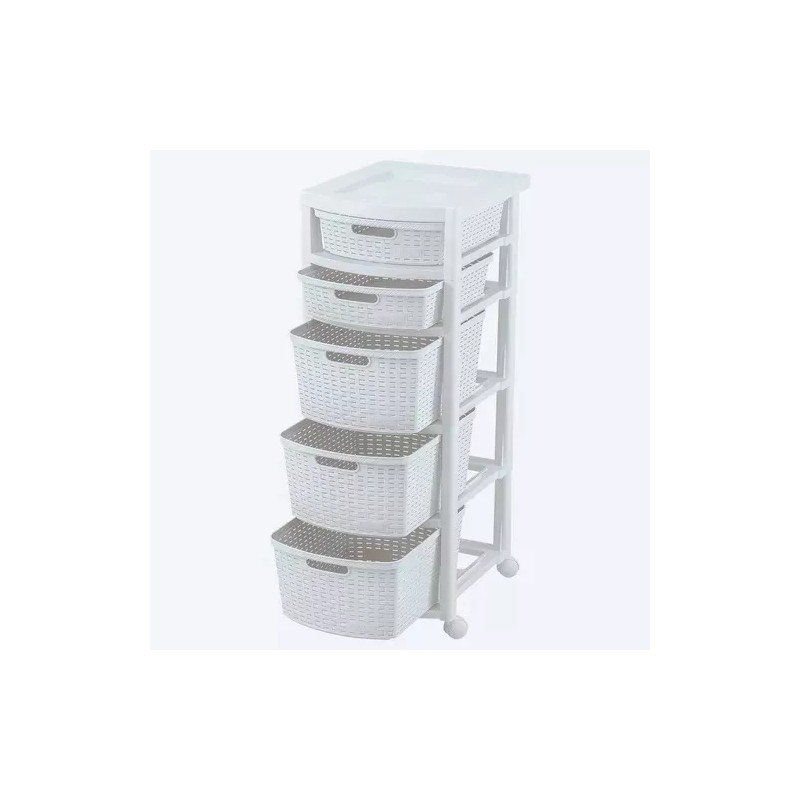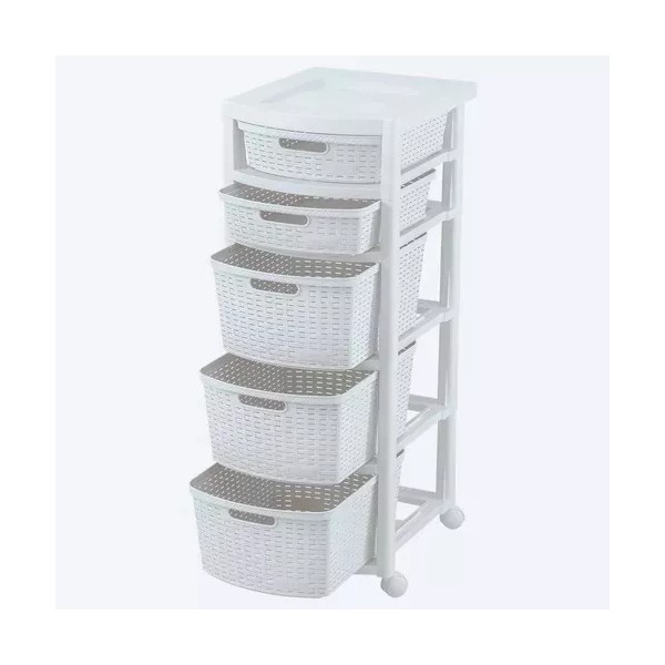 Cajonero con apariencia Rattán con 5 gavetas, tres de ellas con capacidad de 12 kg y las dos superiores con capacidad de 6 kg. Las canastas se pueden retirar completamente y mover fácilmente gracias a las manijas en sus dos extremos. Completamente plástico y con rodachinas que permiten mover lo con facilidad. ¡Apariencia renovada y colores para los hogares de hoy!