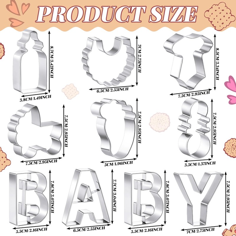• Exceptional Variety: the baby shower cookie cutters are a set of 10 exceptionally varied pieces, including a combination of [B], [A], [B], [Y] letter cookie cutters and a series of baby themed cookie cutters featuring baby bodysuit, bib, baby bottle, baby carriage, rattle, and foot designs; Indulge in the fun of baking with these cookie cutters