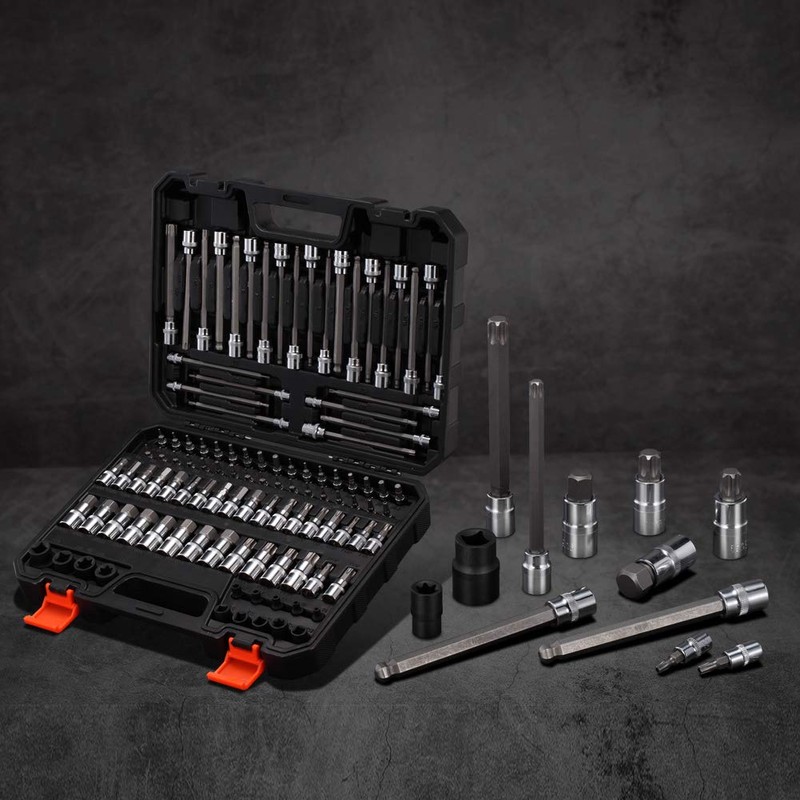- 【COMPLETE ACCESSORIES】: 107PCS high quality bit socket set,including 1/4", 3/8" and 1/2"drive Torx / extra long Torx / tamper proof Torx/hex / ball end hex SAE & metric bit set. Complete accessories to meet your needs.