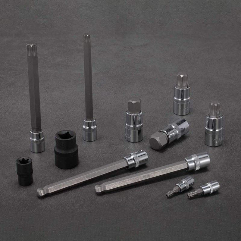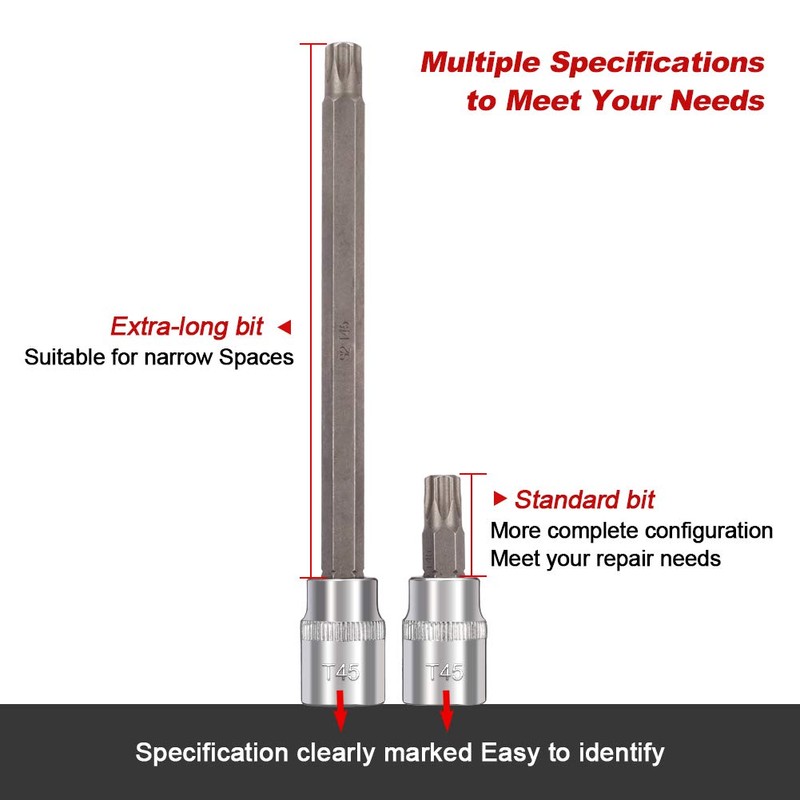 - 【HEAT TREATMENT CR-V】: The socket base is made of chrome vanadium steel with stronger hardness after heat treated and provides higher torque.The surface is mirror chrome plated,and the E-Torx Sockets with manganese phosphate coating are more anti-corrosive and anti-rust than Black oxide coating, extending the service life.