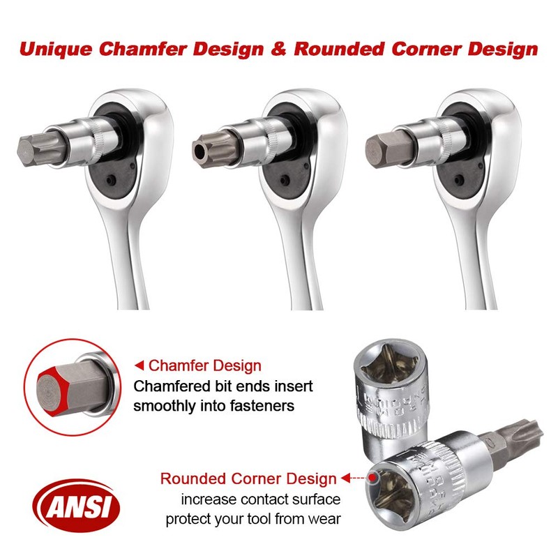 - 【CHAMFERING DESIGN】: Each bits head has a unique chamfering design, which makes it easier to insert the bit head into the fastener. And increase the contact area with the fastener, reduce wear, protect the fastener.Complies with ANSI standards.