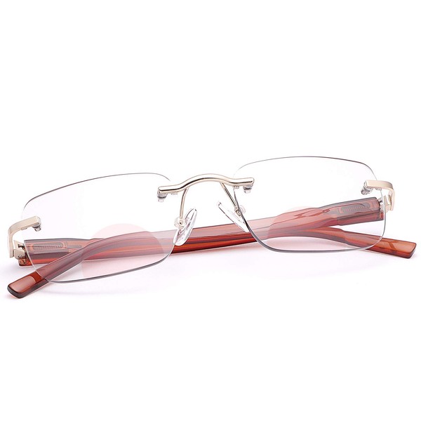 - 【Multifunctional Rimless Bifocal Reading Glasses】▶ Bifocal lens with blue light blocking and photochromic function,These lenses accommodate for both near and far vision by adding a unique lower lens with add vision value for reading and near vision, while blocks 100% of harmful blue light. Photochromic lenses shift from reading glasses indoor to reading sunglasses outdoor, also you can use it as normal photochromic sunglasses,Radiation protection, UV protection.