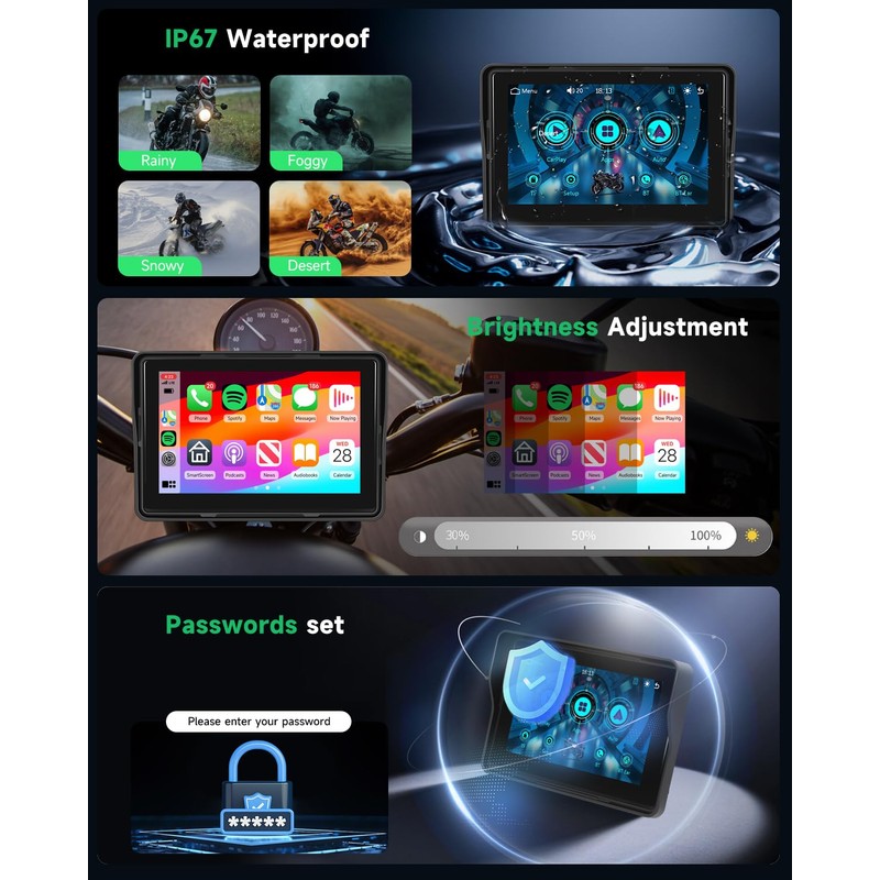 - IP67 waterproof, adjustable brightness and password setting: the portable motorcycle car radio has a waterproof function and can be used on rainy days. The waterproof rating is IP67, while the brightness of the screen can be adjusted to suit different scenes. The portable carplay display for motorcycles also supports password setting to protect your privacy and device security.