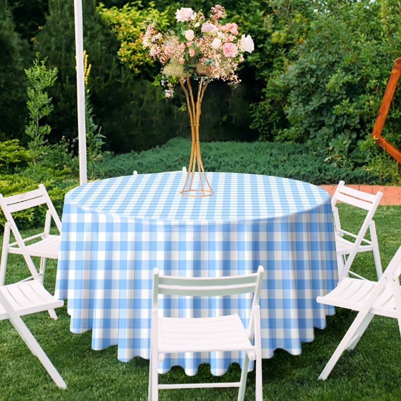 - Round checkered tablecloth: The light blue gingham tablecloth are made of high-quality plastic, which is light but waterproof. The round gingham tablecloth will enhance the overall aesthetic of the dining table
