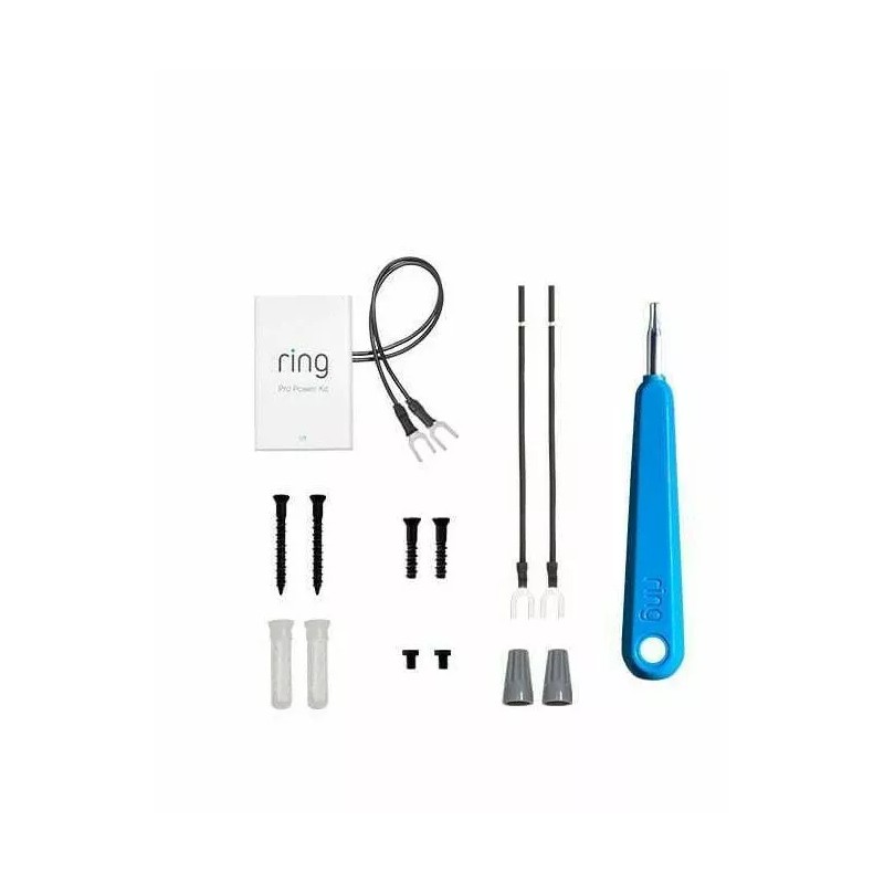 Spare parts to help you set up your Video Doorbell Pro 2 in just a few minutes. Comes with a screwdriver, a Pro Power Kit, two mounting screws and two mounting anchors, two Corner Kit screws and two security screws, two wire extenders, as well as two wire nuts.