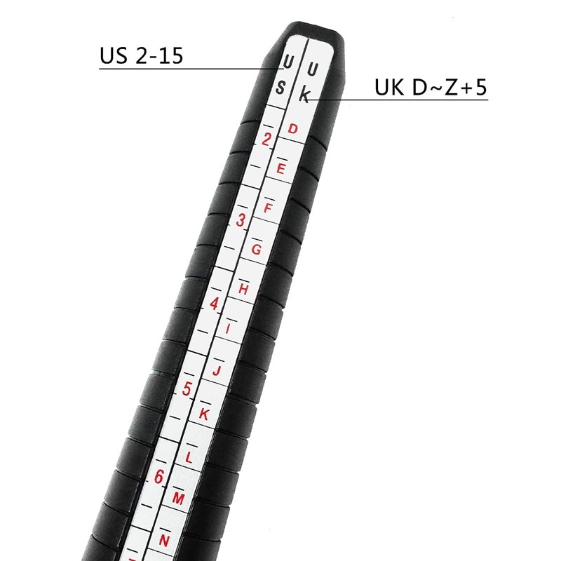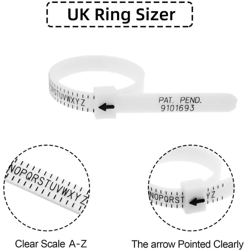 - Plastic ring sizer with UK sizes A-Z and US sizes 0-13. Example: "8 Q" is US size 8, UK size Q. "-8 R" corresponds to US size 8.5, UK size R etc.
